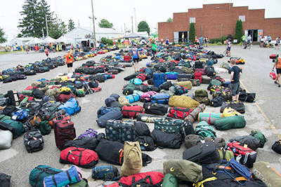 Luggage, brought in by semis, piles up waiting for the cyclists.
